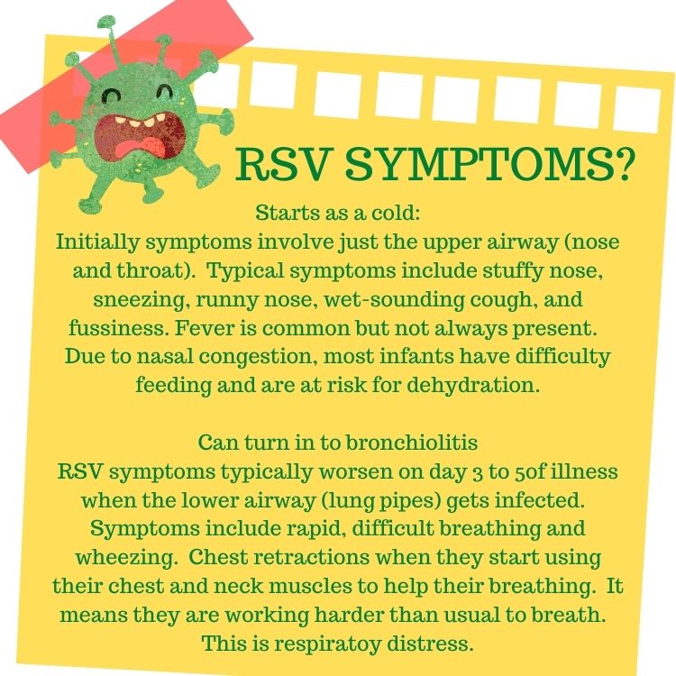 Starts as a cold: Initially symptoms involve just the upper airway (nose and throat). Typical symptoms include stuffy nose, sneezing, runny nose, wet-sounding cough, and fussiness. Fever is common but not always present. Due to nasal congestion, most infants have difficulty feeding and are at risk for dehydration. Can turn in to bronchiolitis RSV symptoms typically worsen on day 3 to 5of illness when the lower airway (lung pipes) gets infected. Symptoms include rapid, difficult breathing and wheezing. Chest retractions when they start using their chest and neck muscles to help their breathing. It means they are working harder than usual to breath. This is respiratoy distress.