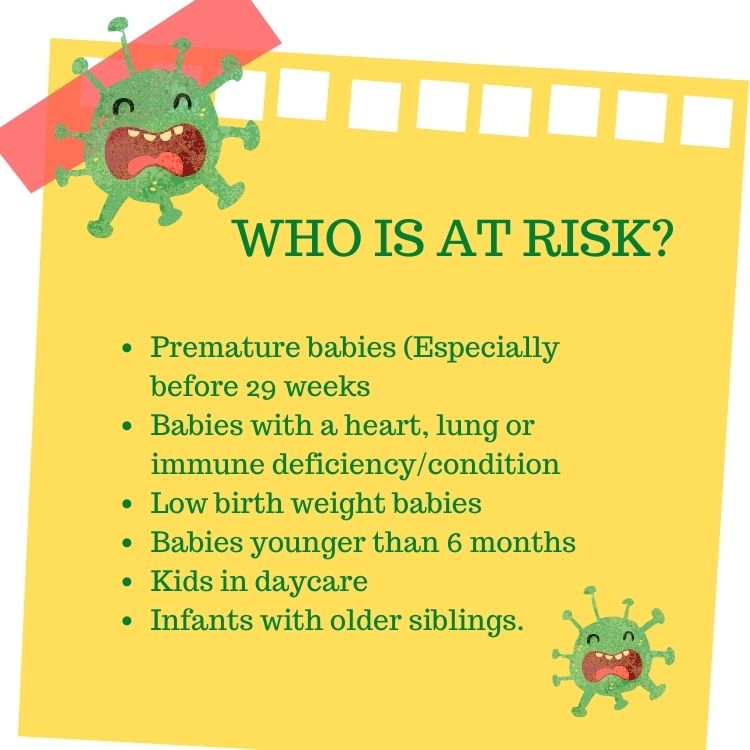 Premature babies (Especially before 29 weeks Babies with a heart, lung or immune deficiency/condition Low birth weight babies Babies younger than 6 months Kids in daycare Infants with older siblings.