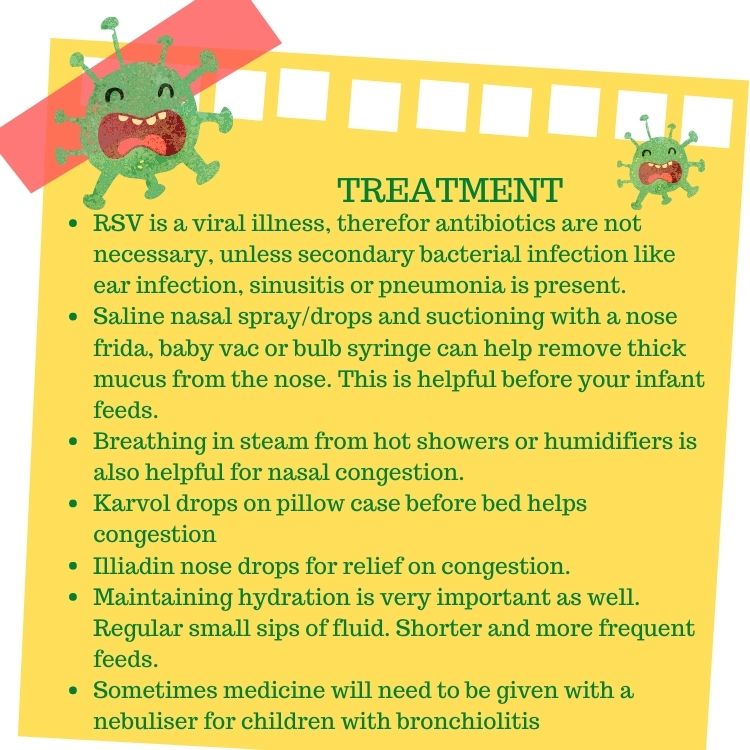 RSV is a viral illness, therefor antibiotics are not necessary, unless secondary bacterial infection like ear infection, sinusitis or pneumonia is present. Saline nasal spray/drops and suctioning with a nose frida, baby vac or bulb syringe can help remove thick mucus from the nose. This is helpful before your infant feeds. Breathing in steam from hot showers or humidifiers is also helpful for nasal congestion. Karvol drops on pillow case before bed helps congestion Illiadin nose drops for relief on congestion. Maintaining hydration is very important as well. Regular small sips of fluid. Shorted and more frequent feeds. Sometimes medicine will need to be given with a nebuliser for children with bronchiolitis