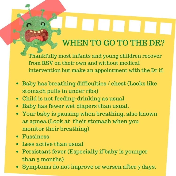 Thankfully most infants and young children recover from RSV on their own and without medical intervention but make an appointment with the Dr if: